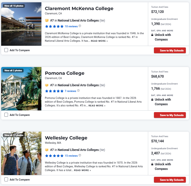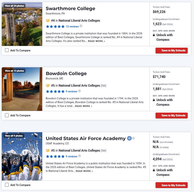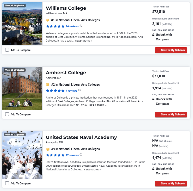In addition to national universities, this year's rankings also include rankings for liberal arts colleges.The rankings of Liberal Arts Colleges Top 50 are as follows: