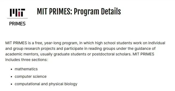 MIT PRIMES is a one-year free research program led by MIT. Admitted students will collaborate with MIT researchers to conduct topic selection and research focusing on mathematics, computer science, and computational biology.